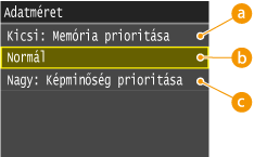 A beolvasott dokumentumok a megadott fájlformátumokba lesznek konvertálva. Ekkor megadhatja a fájltömörítési arányt. <Kicsi: Memória prioritása> választása esetén a tömörítési arány a szokásosnál nagyobb lesz, így alacsonyabb képminőségű, de kisebb fájlok jönnek létre. A <Nagy: Képminőség prioritása> választása esetén ezzel szemben a szokásosnál alacsonyabb a tömörítési arány, tehát jobb képminőségű és nagyobb fájlok jönnek létre.
