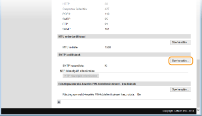 Az NTP/SNTP-kiszolgálóval folytatott kommunikáció teszteléseTesztelheti, hogy a készülék kommunikál-e a bejegyzett időkiszolgálóval az SNTP protokollon keresztül. Nyissa meg a [Beállítások/Bejegyzés]
