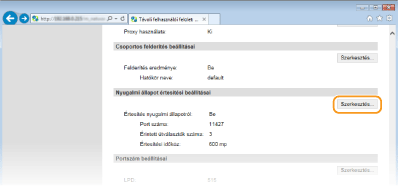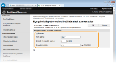 A jelölőnégyzet bejelölésével értesíthet egy eszközfelügyeleti szoftvert a készülék üzemállapotáról. Ha az [Értesítés] jelölőnégyzet be van jelölve, akkor a készülék alvó üzemmódban várhatóan elkerüli a felesleges kommunikációt, és csökkenti a teljes energiafogyasztást. [Port száma]