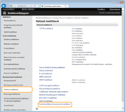 Az iW Management Console beépülő modullal történő kommunikációhoz engedélyeznie kell a kijelölt portbeállításokat és az SNMP (SNMPv1 vagy SNMPv3) beállításokat. Válassza a [Írható/olvasható] (teljes hozzáférési engedély) a [MIB hozzáférési engedély] lehetőséghez az SNMP (SNMPv1 vagy SNMPv3) beállításban. Hozzárendelt port beállításai A készülék figyelése és vezérlése SNMP protokollal