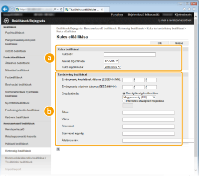 Ha a TLS (Transport Layer Security) megoldáson keresztül folytatott titkosított kommunikációhoz kulcspárra van szükség, akkor az előállítható a készülékkel. A TLS protokollt a készülék Távoli felhasználói felületen keresztüli elérésekor használhatja. A készülékre legfeljebb öt kulcspár jegyezhető be.