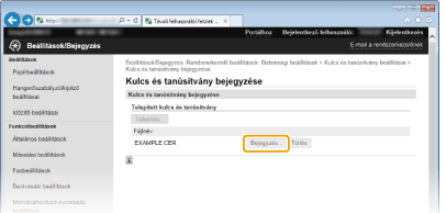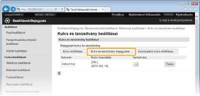 A készülékkel használni kívánt kulcspárok és digitális tanúsítványok hitelesítésszolgáltatóktól szerezhetők be. A fájlokat mentheti a számítógépre, majd bejegyezheti a Távoli felhasználói felülettel. Győződjön meg róla, hogy a kulcspár és a tanúsítvány megfelel a készülék által támasztott követelményeknek (