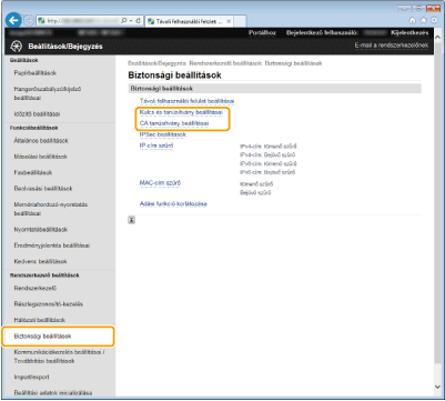 [Kulcs és tanúsítvány beállításai] (kulcspárok esetén) vagy [CA tanúsítvány beállításai] (hitelesítésszolgáltatói tanúsítványok esetén) lehetőségre.