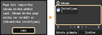 Ja sākuma ekrāns ir pilns un tajā vairs nevar reģistrēt iestatījumus, sākuma ekrānā izdzēsiet atstarpes, izmantojot <Sākumekrāna iestatījumi>, vai noņemiet reģistrētās pogas. Pogu dzēšana