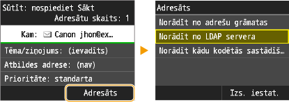Ja birojā ir instalēts LDAP serveris, varat izmantot serverī reģistrētus adresātus. Lai norādītu adresātus, piekļūstiet LDAP serverim, izmantojot iekārtu, un pēc tam meklējiet adresātu.