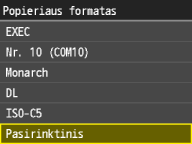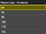 Jei įdėjus popieriaus anksčiau pavaizduotas ekranas nerodomasJeigu į universalųjį dėklą visuomet dedate tokį patį popierių, popieriaus nustatymo veiksmus galite praleisti įregistravę popieriaus formatą ir tipą kaip numatytąjį parametrą. Įregistravus numatytąjį parametrą, anksčiau pavaizduotas ekranas nerodomas. Jei norite matyti ekraną, <Išjungta> pasirinkite <Užregistruoti numatyt. paramet.> (Numatytųjų popieriaus parametrų priskyrimas universaliajam dėklui).