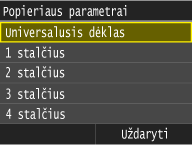 Galite priskirti numatytuosius popieriaus parametrus universaliajam dėklui. Įregistravus numatytuosius parametrus, kaskart į universalųjį dėklą įdėjus tokį patį popierių, nereikės gaišti laiko vėl nurodant parametrus.