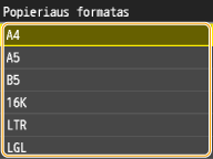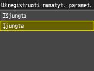 Jei numatytieji popieriaus parametrai įregistruoti, įdėjus popieriaus, parametrų ekranas nerodomas ir visada naudojami tie patys parametrai. Jei įdedate kitokio formato arba tipo popierių ir nepakeičiate parametrų, aparatas gali spausdinti netinkamai. Norėdami išvengti šios problemos, išjunkite numatytuosius parametrus 3 veiksme pasirinkdami <Išjungta>, tada įdėkite popierių.