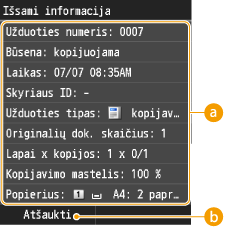 Rodomas kopijų skaičius, parametrai ir kita informacija. Jei norite tik peržiūrėti informaciją ir neatšaukti kopijavimo, paspauskite