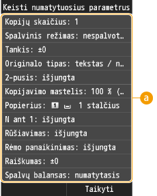 Numatytieji parametrai yra rodomi įjungus aparatą arba paspaudus . Jei šiuos numatytuosius parametrus pakeisite pagal dažnai atliekamas operacijas, jums nebereikės tų pačių parametrų konfigūruoti kiekvieną kartą kopijuojant.