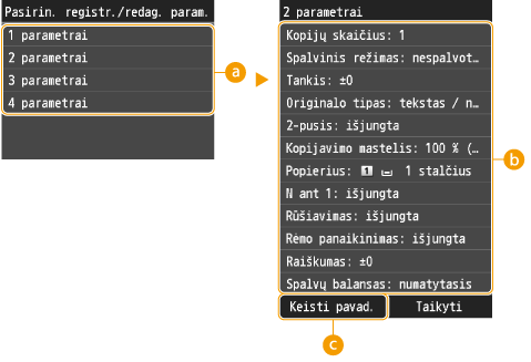 Galite užregistruoti keturis dažnai naudojamus kopijavimo parametrų derinius. Jei prireikus tiesiog pasirinksite užregistruotą parametrų derinį, jums nebereikės tų pačių parametrų konfigūruoti kiekvieną kartą kopijuojant. Pavyzdžiui, jei dažnai kopijuojate 5 kopijas, nustatykite <Rėmo panaikinimas> reikšmę <Įjungta> ir kopijuodami padidinkite ryškumą. Galite užregistruoti parametrų kombinacijas bet kokiu pavadinimu.