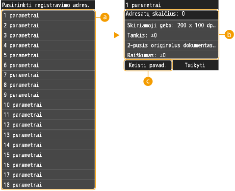 Galite užregistruoti keturis dažnai naudojamus fakso parametrų derinius. Jei prireikus tiesiog pasirinksite užregistruotą parametrų derinį, jums nebereikės tų pačių parametrų konfigūruoti kiekvieną kartą siunčiant faksogramas, pavyzdžiui, jei dažnai nustatote 5 gavėjų numerius, nustatote dvipusį originalą ir siųsdami faksogramas padidinate ryškumą. Galite užregistruoti parametrų derinius nuo <1 parametrai> iki <18 parametrai>.
