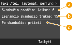 Galite nustatyti, kad aparatas automatiškai priimtų faksogramas, kai priimamo skambučio signalas skamba nurodytą laikotarpį. Įjungti automatinį priėmimą