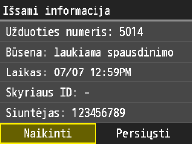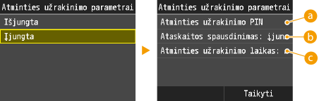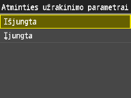 Jei norite spausdinti atmintyje saugomus gautus dokumentus, nustatykite <Atminties užrakinimo parametrai> reikšmę <Išjungta>. Spausdinami visi atmintyje esantys dokumentai.