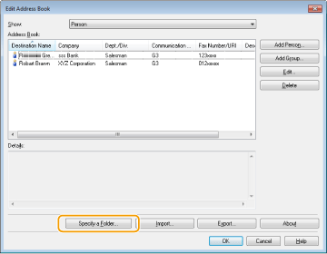 Dialogo lange [Edit Address Books] (Adresų knygelių redagavimas) spustelėkite [Specify a Folder] (Nurodyti aplanką).