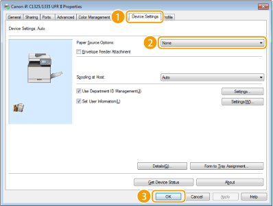 Galite naudoti PCL5c, PCL6 ir PS spausdintuvo tvarkyklę, taip pat UFRII spausdintuvo tvarkyklę. Galimi spausdinimo parametrai skiriasi atsižvelgiant į spausdintuvo tvarkyklę. Jei reikia daugiau informacijos, kiekviename spausdintuvo tvarkyklės ekrane spustelėkite [Help] (Žinynas).