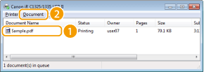 Spausdinimą galite atšaukti iš „Remote UI“ (Nuotolinio vartotojo sąsaja) puslapio [Job Status]: Spausdinamų dokumentų esamos būsenos tikrinimas