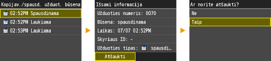 <Kopijavimo/spausdinimo užduotis>  <Užduoties būsena>  Ekrane <Kopijav./spausd. užduot. būsena> bakstelėkite faksu siunčiamą dokumentą  <Atšaukti>  <Taip>