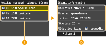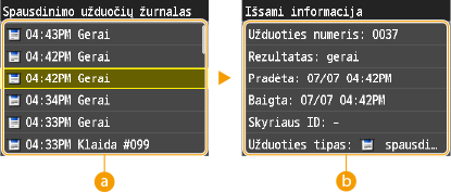 Galite patikrinti vykdomo spausdinimo būsenas ir išspausdintų dokumentų žurnalus.