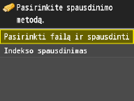 Galite spausdinti USB atminties įrenginyje saugomų vaizdo failų (tik JPEG) miniatiūras. Jei norite atvaizdus spausdinti kaip miniatiūras, ekrane bakstelėkite <Indekso spausdinimas> ir pereikite prie kito veiksmo.