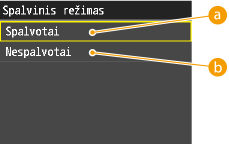 Jei persidengia skirtingų spalvų duomenys, aparatas gali neatskirti spalvoto ir vienspalvio vaizdo net ir pasirinkus <Spalv.>. Pvz., nors spaudinys atrodo vienspalvis, jei persidengia skirtingų spalvų duomenys, jis spausdinamas spalvų režimu, taip naudojant spausdinimui spalvotų dažomųjų miltelių kasetes, ne juodų dažomųjų miltelių kasetę. Be to, jei duomenys naudojamoje programoje sukurti kaip spalvoti duomenys, jie spausdinami spalvų režimu, net jei duomenys atrodo vienspalviai.
