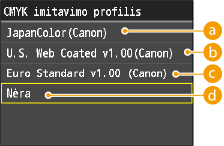 Jei <Nėra> pasirinkta dalyje <CMYK imitavimo profilis>, CMYK grynai juodų duomenų apdorojimo parametras netaikomas.
