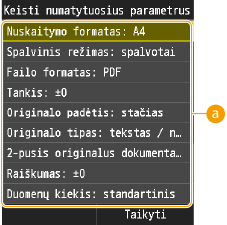<Meniu>  <Nuskaitymo parametrai>  <Failo parametrai>  <Keisti numatytuosius parametrus>  Bakstelėkite parametrą  Pakeiskite pasirinkto elemento numatytąją reikšmę <Taikyti>