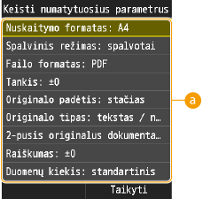 Numatytieji parametrai yra rodomi įjungus aparatą arba paspaudus . Jei šiuos numatytuosius parametrus pakeisite pagal dažnai atliekamas operacijas, jums nebereikės tų pačių parametrų konfigūruoti kiekvieną kartą nuskaitant.