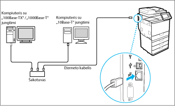 Prijunkite aparatą prie kompiuterio per maršrutizatorių. Aparatui prie maršrutizatoriaus prijungti naudokite LAN kabelį.