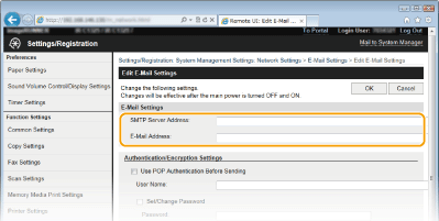 Naudodami priemonę „Remote UI“ (Nuotolinio vartotojo sąsaja), konfigūruokite el. pašto parametrus. Norėdami gauti daugiau informacijos apie reikalingus parametrus, kreipkitės į interneto paslaugų tiekėją arba tinklo administratorių.