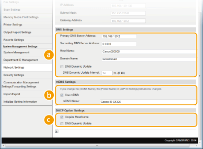 Pažymėkite šį žymės langelį, kad pasikeitus aparato IP adresui būtų dinamiškai naujinami DNS įrašai. Norėdami nurodyti adresų, kuriuos norite užregistruoti DNS serveryje, tipą (-us), pažymėkite žymės langelį [Rankinis adreso registravimas], [Įsimenamojo adreso registrav.] arba [Neįsimenamojo adreso registrav.]. Norėdami nurodyti laikotarpį tarp naujinimų, teksto lauke [DNS Dynamic Update Interval] įveskite laiką valandomis.