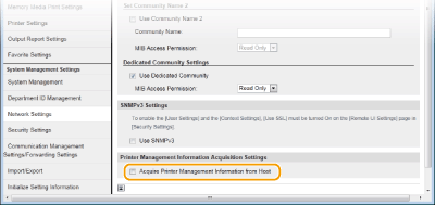 Pažymėkite žymės langelį [Use Dedicated Community] ir nurodykite parametrą [MIB Access Permission].