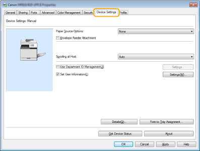 Pažymėkite šį žymės langelį, kad kas kartą jums spausdinant ar siunčiant faksogramą iš kompiuterio, būtų rodomas iššokantysis ekranas [Confirm Department ID/PIN] (Patvirtinti skyriaus ID / PIN). [Do Not Use Department ID Management When B&W Printing] (Nenaudoti skyriaus ID valdymo, kai spausdinama nespalvotai)