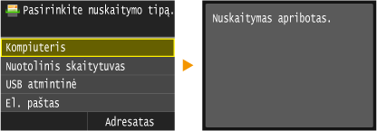 [Number of Pages] įveskite apatines ribas. Jei pažymėtas žymės langelis [Restrict Scan], vadinasi, dokumentų nuskaitymas į USB atminties įrenginius, el. laiškus, bendrai naudojamus aplankus ir failų serverius išjungtas. Be to, galite išjungti dokumentų nuskaitymą į kompiuterius <Kompiuteris> ir <Nuotolinis skaitytuvas>. Tačiau dokumentų nuskaitymą į kompiuterius galite išjungti tik visiems vartotojams (Užduočių blokavimas, kai skyriaus ID nežinomas).