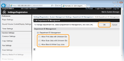 Pažymėkite norimos išjungti skyriaus ID funkcijos žymės langelį. ![]() Pažymėkite norimus [Restrict Total Prints], [Restrict Total Color Prints] ir [Restrict Total Black & White Prints] žymų langelius, kad nurodytumėte bendro galimo spausdinti puslapių skaičiaus viršutines ribas.