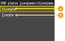 Galite išjungti aparato galinėje pusėje esantį USB prievadą. Jei šis prievadas bus išjungtas, aparatas negalės palaikyti ryšio su kompiuterio per USB. Šis parametras neturi įtakos priekiniam USB prievadui, skirtam USB atminties įrenginiams prijungti.