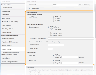 Pasirinkite, kad nurodytumėte vieną IPv4 adresą arba IPv4 adresų diapazoną „IPSec“ taikyti. Įveskite IPv4 adresą (arba diapazoną) teksto lauke [Addresses to Set Manually].