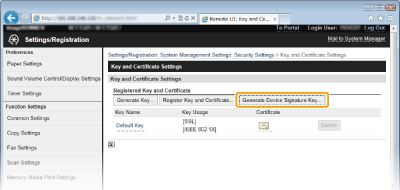 Spustelėkite [Security Settings]  [Key and Certificate Settings].