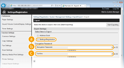 Meniu parinkčių parametrų duomenis galite įrašyti į kompiuterį, arba aparate užregistruoti įrašytus duomenis. Eksportuoti duomenys gali būti importuoti. Jei naudojamas tas pats modelis, kai kurie aparatai gali importuoti duomenis, kurie buvo eksportuoti iš šio aparato, ir atvirkščiai. Šias operacijas galima atlikti tik prisijungus sistemos administratoriaus režimu.