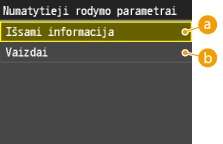Visi atminties laikmenos spausdinimo parametrai išvardyti su trumpais aprašais. Numatytieji parametrai pažymėti durklu (