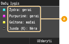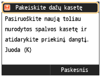 Ekrane rodoma dažomųjų miltelių, kuriuos reikia pakeisti, spalva. Jei reikia pakeisti kelių spalvų dažomųjų miltelių kasetes, tuomet jas keiskite iš eilės šia tvarka: juoda (Black), geltona (Yellow), purpurinė (Magenta), žydra (Cyan).