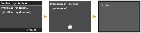 Šis koregavimas išlaiko optimalią būseną, kuri buvo pasiekta atliekant <Visiškai reguliuoti>. Atkreipkite dėmesį, kad šio koregavimo negalėsite atlikti, kol atliekamos kai kurios funkcijos, įskaitant nuskaitymą ir spausdinimą. Jei šio koregavimo rezultatas netenkina, atlikite <Visiškai reguliuoti>. Šis koregavimas gali būti atliekamas automatiškai, kai pakeičiate kasetę.