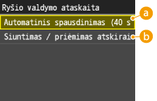 Pasirinkite <Įjungta>, kad ataskaita būtų spausdinama automatiškai kas 40 perdavimų, arba <Išjungta>, jei nenorite, kad ataskaita būtų spausdinama automatiškai.