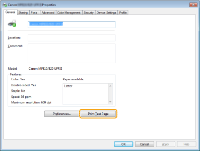 Spustelėkite [Print Test Page] (Spausdinti bandomąjį puslapį), kad išspausdintumėte bandomąjį puslapį.