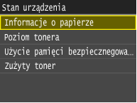 wyświetlony zostaje ekran umożliwiający sprawdzenie statusu drukowanych, wysyłanych lub otrzymywanych dokumentów, a także statusu urządzenia, np. poziomu toneru w zasobnikach lub danych na temat ustawień sieciowych, takich jak ustawienia adresu IP urządzenia.