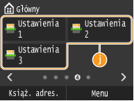 <Ulubione ustawienia kopiowania> <Ulubione ustawienia faksu> <Ulubione ustawienia skanowania>Wyświetla często wykorzystywane zapisane ustawienia dla funkcji kopiowania, faksowania i skanowania. Funkcja <Kopiowanie identyfikatora> jest wstępnie zapisana w pozycji <Ustawienia 1>. Zapisywanie najczęściej używanych ustawień kopiowania