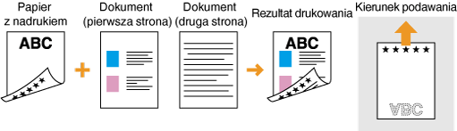 Ustawienie <Przełącz metodę podaw. papieru>W przypadku drukowania na uprzednio zadrukowanym papierze konieczna jest zmiana kierunku ułożenia strony za każdym razem, gdy wykonywane jest drukowanie 1- i 2-stronne. Jednak jeśli opcja <Przełącz metodę podaw. papieru> jest ustawiona na <Priorytet drukowanej strony>, wybrany kierunek ułożenia strony przy ładowaniu jednostronnie zadrukowanego papieru do wydruku 2-stronnego (strona z logo do dołu) może być również używany w przypadku druku 1-stronnego. Ustawienie to jest szczególnie przydatne, gdy wydruki 1-stronne są wykonywane tak samo często jak 2-stronne. Przełącz metodę podaw. papieru