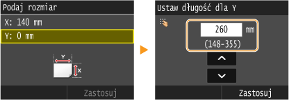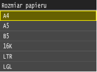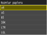 Jeśli do tacy wielofunkcyjnej ładowany jest zawsze ten sam format i rodzaj papieru, można pominąć konfigurację ustawień, rejestrując go jako ustawienie domyślne. Jednak po zarejestrowaniu ustawienia domyślnego ekran pokazany powyżej nie jest wyświetlany. Aby go wyświetlić, należy wybrać opcję <Wyłącz> dla ustawienia <Zarejestruj ustawienia domyślne> (Zapisywanie ustawień domyślnych papieru dla tacy wielofunkcyjnej).