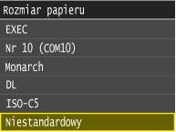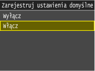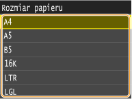 Po zarejestrowaniu ustawienia domyślnego ekran ustawień papieru nie jest wyświetlany przy jego ładowaniu i używana jest zawsze ta sama konfiguracja. Jeśli załadowany zostanie inny format lub typ papieru bez zmiany ustawień, urządzenie może nie drukować poprawnie. Aby uniknąć tego problemu, należy wyłączyć ustawienia domyślne, wybierając opcję <Wyłącz> w kroku 3, po czym załadować papier.