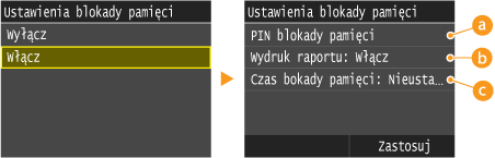 Umożliwia zapisanie hasła o maksymalnej długości siedmiu cyfr. Aby zapisać hasło, wprowadź je za pomocą klawiszy numerycznych i dotknij przycisk <Zastosuj>. Ponownie wprowadź te same cyfry, aby potwierdzić hasło i dotknij przycisk <Zastosuj>. Podanie hasła jest konieczne do zmiany ustawień pamięci do zapisu lub do wyłączenia funkcji Odbiór do pamięci w celu wydrukowania wszystkich przechowywanych dokumentów. Jeśli nie chcesz zapisywać hasła, nic nie wprowadzaj i dotknij przycisk <Zastosuj>.